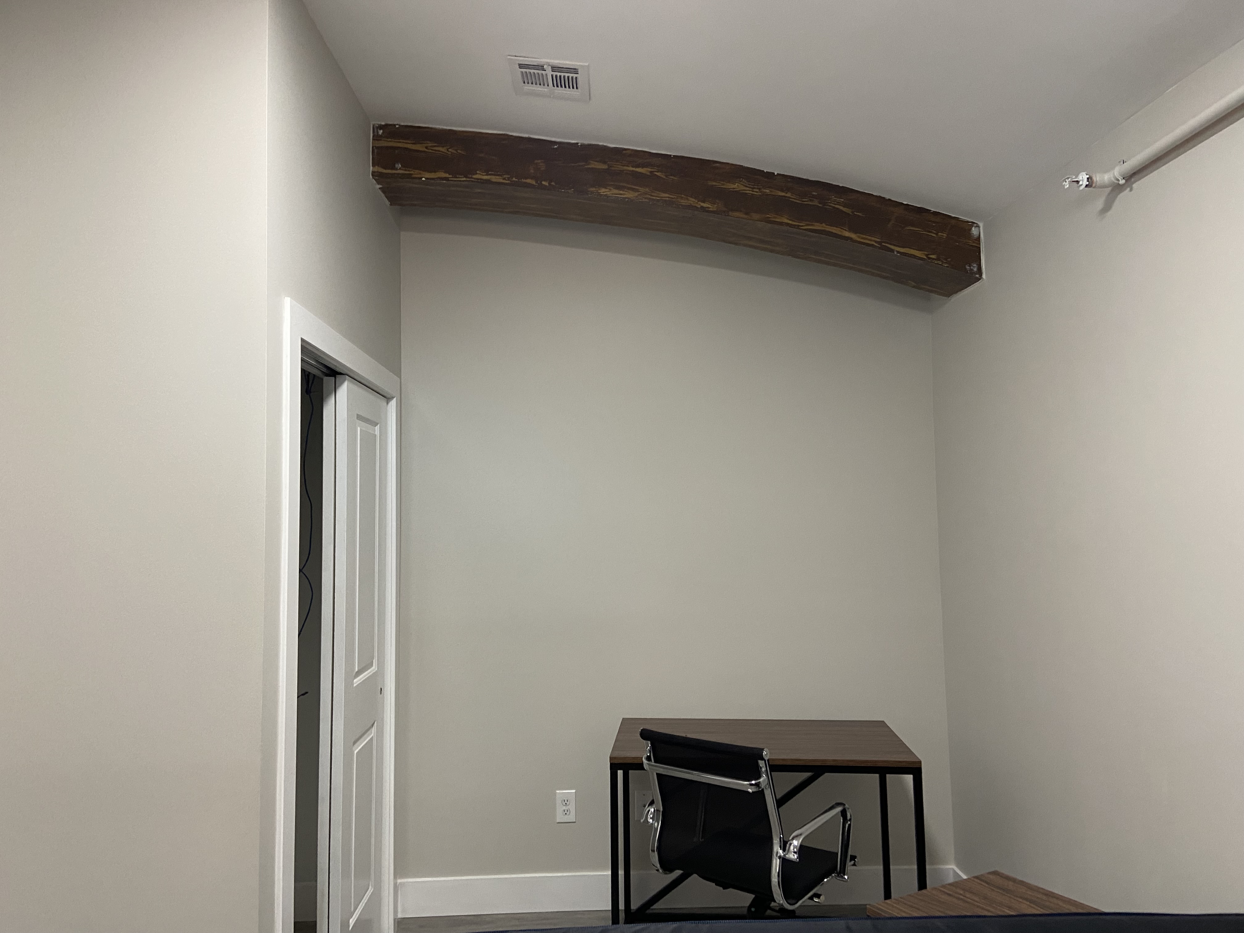 Beams from sanctuary ceiling incorporated into apartment (to be refinished):